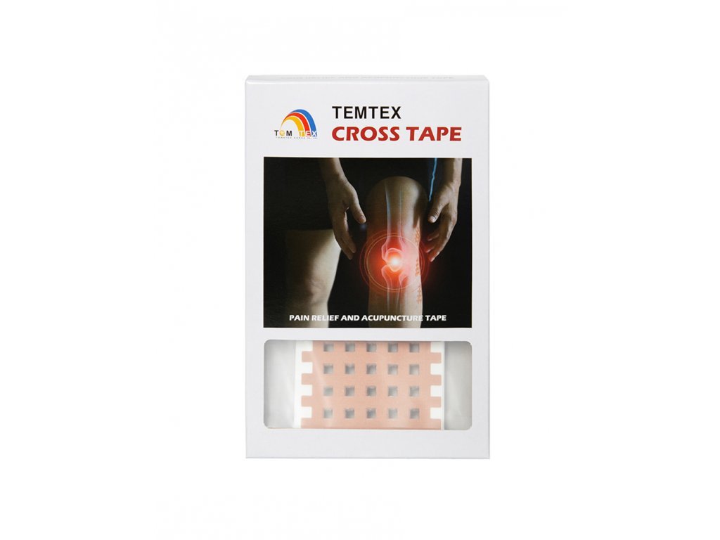 Cross tape, je malá, neelastická mriežka, ktorú prikladáme na tzv. spúšťacie body. Svaly sú ovládané nielen somatomotorickými a somatosenzitívnymi nervami, ale tiež vegetatívnymi, ktoré majú vplyv na svaly a kožu. Koža a svaly sú teda ústredné tkanivá pre prenos nervových vzruchov. Cross tape môže pomôcť vyriešiť nielen svalové, ale aj cievne problémy. Obsahuje hypoalergénne lepidlo, neobsahuje latex, je vodeodolný. Temtex Cross tape je skladný až 2 roky, pri 10-25 ° C a 40-70% vlhkosti.